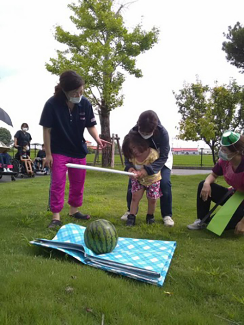 午後は、小学生のお友達はいーはとーぶのお楽しみ会で、スイカ割りにも挑戦しましたよ 🙂